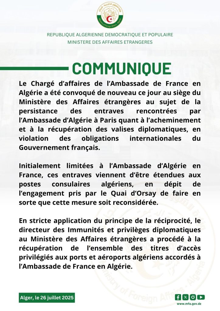 En effet et dans un communiqué rendu public ce samedi 26 juillet 2025, le ministère des Affaires étrangères, indique avoir convoqué une nouvelle fois le Chargé d’affaires de l’Ambassade de France en Algérie, afin de dénoncer «la persistance des entraves rencontrées par I’Ambassade d’Algérie à Paris quant à l’acheminement à la récupération des valises diplomatiques», et ce, en violation des obligations internationales du gouvernement français.