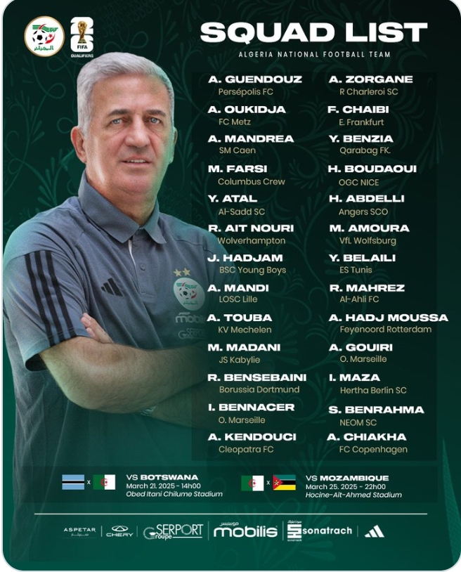 Les Fennecs du Désert vont entrer en stage au centre technique national de la FAF à Sidi Moussa à partir du 17 Mars, pour préparer ces deux rencontres, avec l’objectif de prendre option pour le mondial 2026 qui aura lieu aux USA, le Canada et le Mexique. Le sélectionneur national animera une conférence de presse ce lundi à la salle de conférence Mohamed Sellah au stade Nelson Mandela à Baraki à partir de 15h30. Le premier responsable technique s’expliquera sur ses choix de joueurs pour ces deux confrontations face au Botswana et le Mozambique.