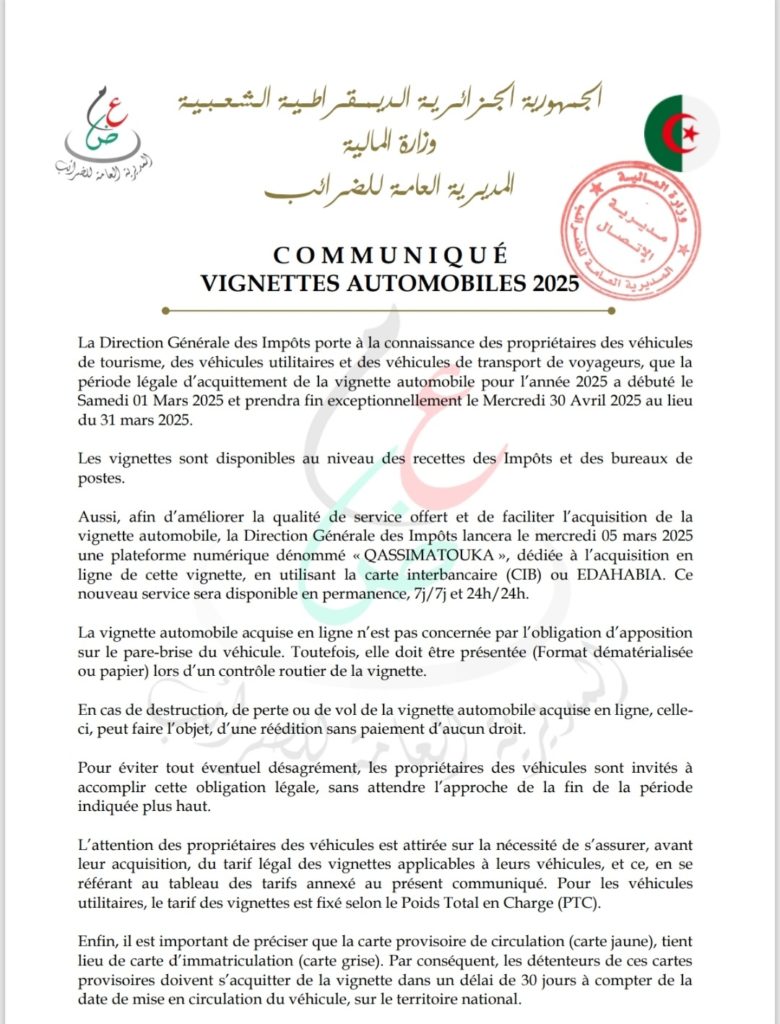 Cette plateforme, qui sera opérationnelle à partir du mercredi 5 mars 2025, permettra aux propriétaires de véhicules d’acquitter la vignette en ligne, 24 heures sur 24 et 7 jours sur 7, en utilisant une carte interbancaire (CIB) ou EDAHABIA.